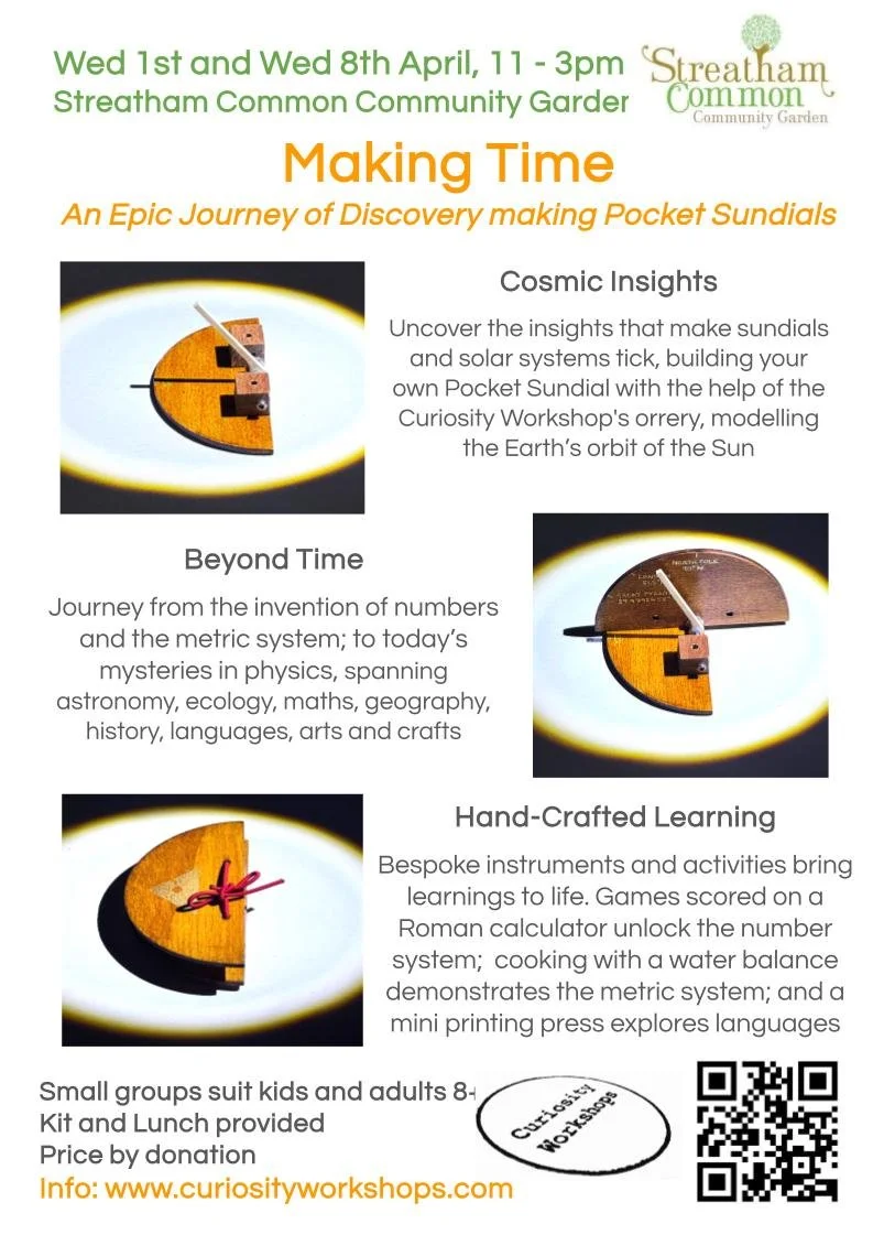 Curiosity Workshops will be hosting several Sundial Making Workshops over the Easter holidays, including at the wonderful Streatham Common Community Gardens. Each session is independent, and you’ll walk away with your own Pocket Sundial, an understanding of how to use it, and more.